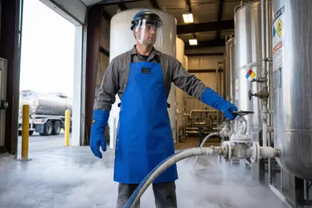 Industrial gas handling, cryogenic equipment maintenance, and LN2 distribution all involve larger volumes and potentially higher splash risks than a typical research lab. The CRYO-APRON®'s industrial-grade materials and certified protection make it appropriate for these higher-exposure environments.